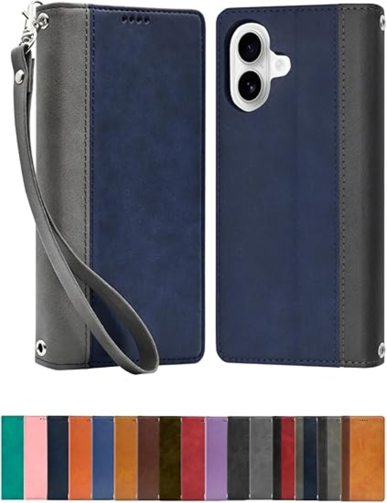 シズカウィル iPhone 16 用 ケース カバー 手帳型 本革調 レザーケース ネイビー×グレー 1個入り a