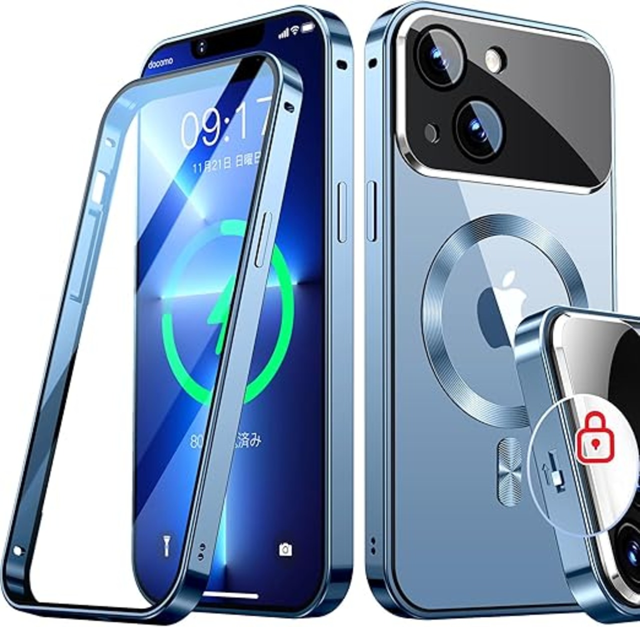 Rosycover【新次元の一体型レンズ・メカニカルロック】iPhone 13 Mini 用の ケース Mag-safe対応[360°全面保護・両面強化ガラス][本体の色・CD Mag-safeリング]マグセーフ ワイヤレス充電対応 ストラップホール付き アルミ合金バンパース アイホン13ミニ 金属 ケースマホケース13 Mini クリア 人気 5.4インチ(シェラブルー) a