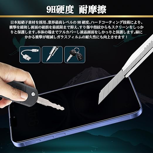 【対応機種】iPhone 16 専用 ガラスフィルム。本製品の表面硬度が9Hなのため、傷や擦れに強い、ナイフや鍵などの尖ったものでも簡単には傷がつきません。耐衝撃性、耐摩耗性に優れております。【Huphuro製品保証の概要】:永久保証について、製品に不具合が生じた場合は、売り手ページにお問い合わせください,お客様からのお問い合わせ内容に応じて代替品交換・返金対応を提供致します。(お一人様につき1回限り)