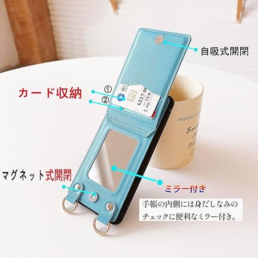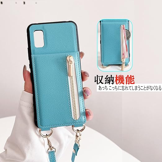 AQUOS Wish3 ケース 高質レザー Wish3 カバー 肩掛け 首かけ 斜めがけ A302SH ケース ショルダー ミラーケース SH-53D カバー 便利 カードポケット スタンド機能 調節可能 軽量 多機能 縦置き ICカード収納 財布型 耐衝撃 携帯 鏡付き AQUOS Wish3 SH-53D/A302SH ケース ターコイズ a