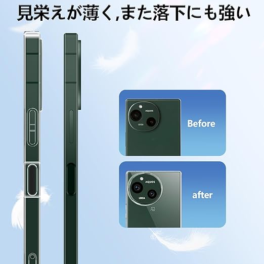 【オシャレ・シンプル】クリアな背面高い透明感を持ち、ケース四隅とボタン部分メッキ加工を応用し、シンプルで高級感溢れて、トレンディなメッキデザインは精緻されたライフスタイルを示します。超軽量薄型、AQUOS本体とピッタリ密着しており、長く持っても手が疲れる感じもありません。