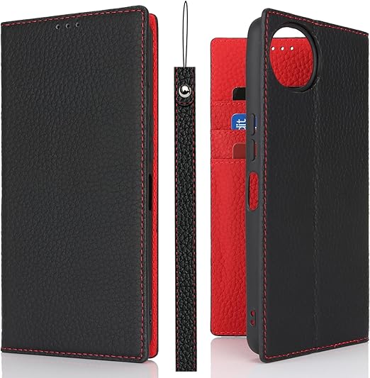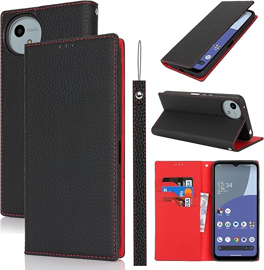 Eastwave Aquos Wish4 ケース 本革 牛革 SH-52E A402SH ケース 手帳型 カバー AQUOS WISH 4 SH-52E A402SH SH-M27 対応 手帳 本革 柔らかい 本皮 スプラットホール付き スプラット同梱 内蔵マグネット - ブラック a