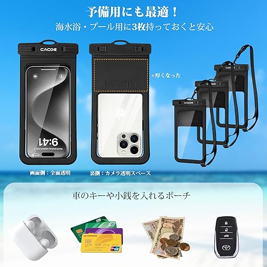 【3枚入り・防水携帯ケース、大型スマホにも対応】家族・カップル・友達同士でシェアでき、傷ついてもまだ予備があります。最大7.2インチ対応スマホ防水ケース、iPhone全機種、Sony Xperia、Xiaomi、AQUOS、Samsung Galaxy、Huaweiなど大画面スマホもケースを外さずそのまま収納でき、旅行先での手間を削減します。お客様満足度向上のために、防水ケースの全面検査システムを導入した上、365日の品質保証を提供しています。夏の必需品、Cacoeでより安心!