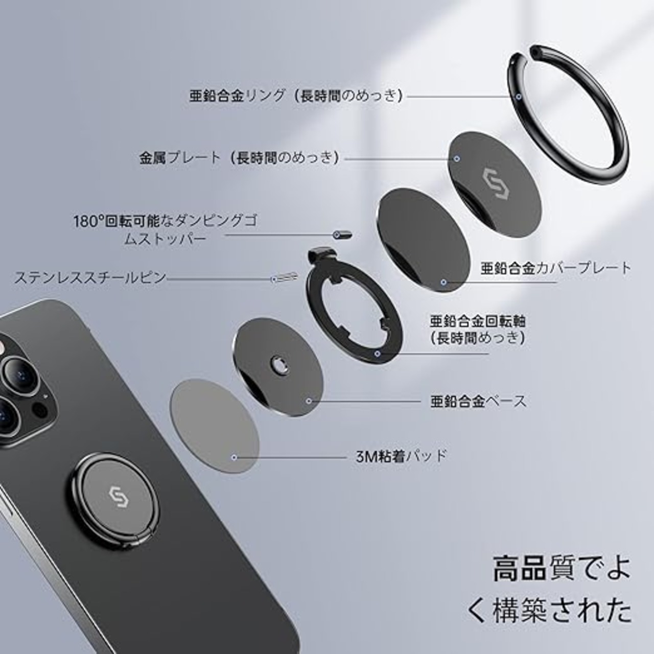 【強力な吸着力】強力な3M VHB粘着パッドがしっかりとスマホに吸着(耐荷重5kg)し、思わぬ落下を防ぎます。ご注意:1. 商品の表面に傷がある原因:リングの背面には青ビニールテープが貼られています。傷は薄い膜に付いていますので、使う時は外してください。2. 背面ガラスのケース:たとえば、iPhone 8 X 12 13 のように, 付属の静電ステッカーを貼ってからご使用ください。3. 凹凸のある表面、シリコーン、ゴム、皮革、コーティングガラスでの使用は推奨しません。取り付けてから24時間は、ス