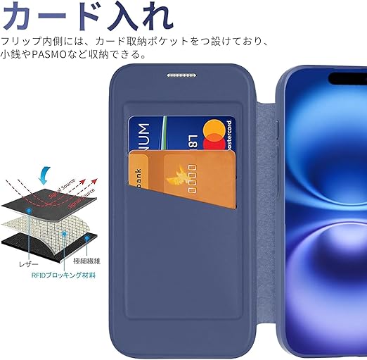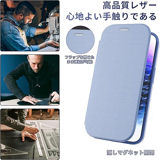 【スタンド機能&手帳型】ハット iPhone13 用 ケース スマホカバー [MagSafe対応・隠しスタンド] 全面保護 耐衝撃 手帳型 レザーケース カード収納2枚 小銭入れ ワイヤレス充電 滑り止め 指紋防止 背面透明 米軍MIL規格取得 6.1インチ 対応 ブルー a