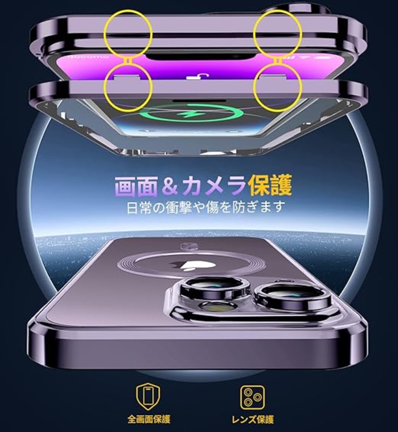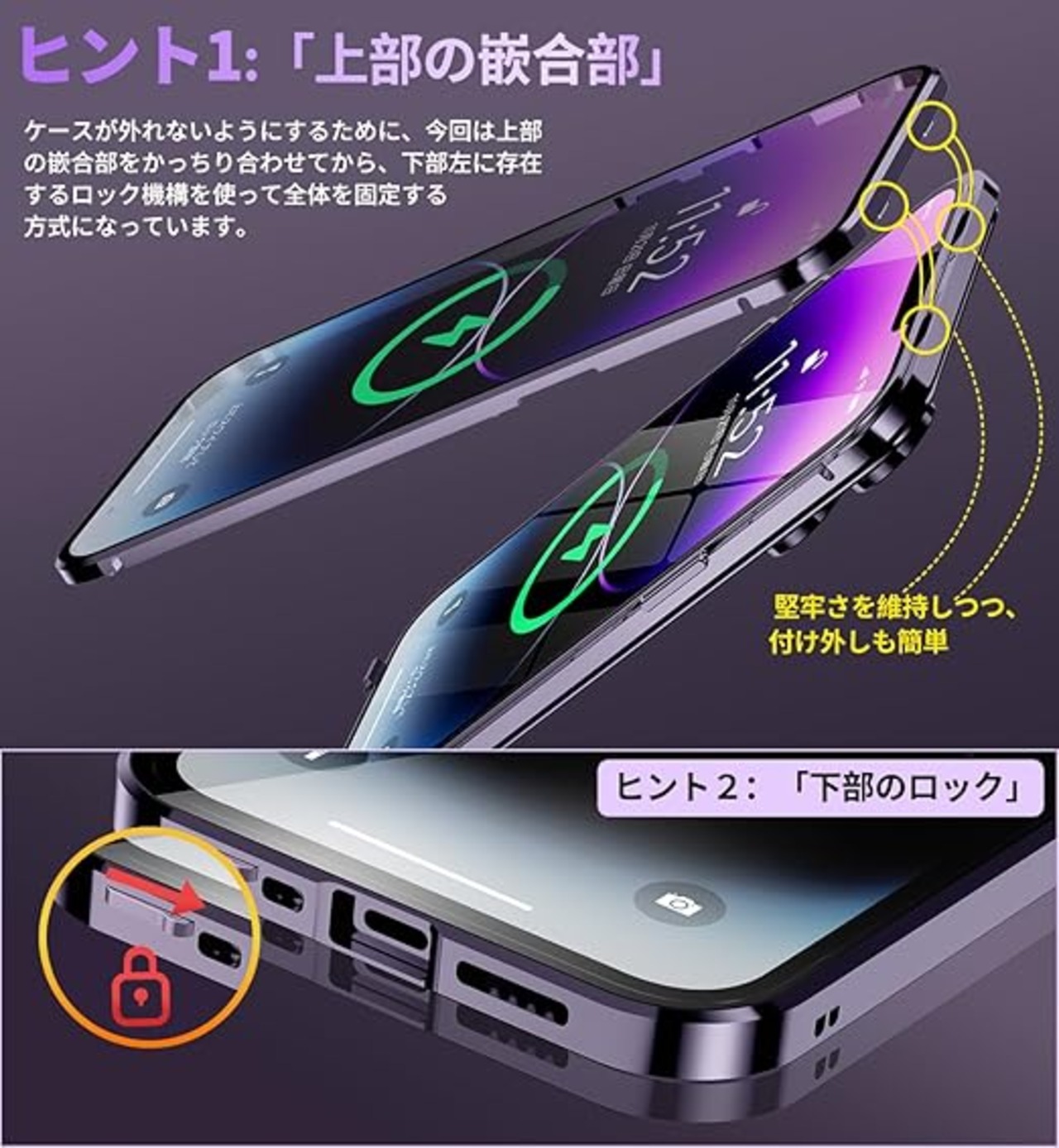 【堅牢さを維持しつつ&付け外しも簡単】両面ケースは堅牢性を追求する時に、少し手間には違いありません。その点を解決したのがあいふぉん14 ロックケースをオススメです。ケースが外れないようにするために、今回は上部の嵌合部をかっちり合わせてから、下部左に存在するロック機構を使って全体を固定する方式になっております。元々、各所にマグネットがあり、それだけでも背面と前面からケースを密着させることできているのですが、実は、それだけだと落とした時などにスマホ本体が外に飛び出す可能性があります。従来のネジ式と違
