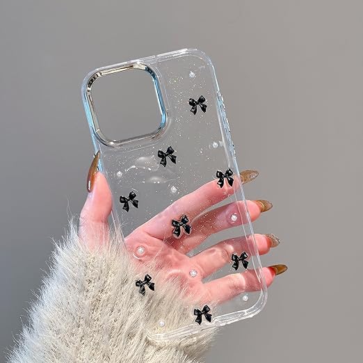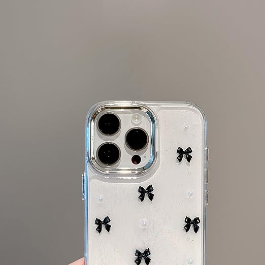 QLTYPRI iPhone13 Pro ケース クリア ブラック ミニリボン おしゃれ 韓国 iPhone13 Proカバー 透明 可愛い 耐衝撃 スマホケース 立体 りぼん装飾 きらきら アイフォン13 Pro ケース、ブラック a