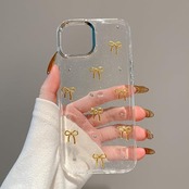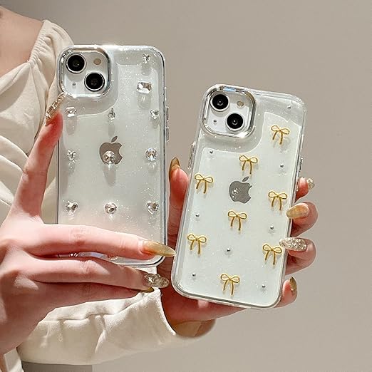 QLTYPRI iPhone14 ケース iPhone13 ケース クリア ゴールド ミニリボン おしゃれ 韓国 透明 可愛い 耐衝撃 スマホケース 立体 りぼん装飾 きらきら アイフォン13/14 ケース、ゴールド a