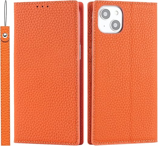 Eastwave アイフォン for iPhone 14 ケース 本革 牛革 for iPhone 14 ケース 手帳型 for iPhone14 カバー 手帳 本革 柔らかい 本皮 スプラットホール付き スプラット同梱 内蔵マグネット-オレンジ a