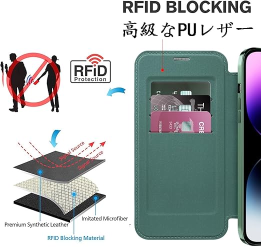 MuZiF iPhone 14 Pro Max 用 ケース 手帳型 Magsafe対応 クリア 背面 透明 高級なPUレザー 永久磁石 マグネット スマホケース カード収納、人気財布型 カバー 軽量 アイフォン14 Pro Max 用 手帳カバー (グリーン) a