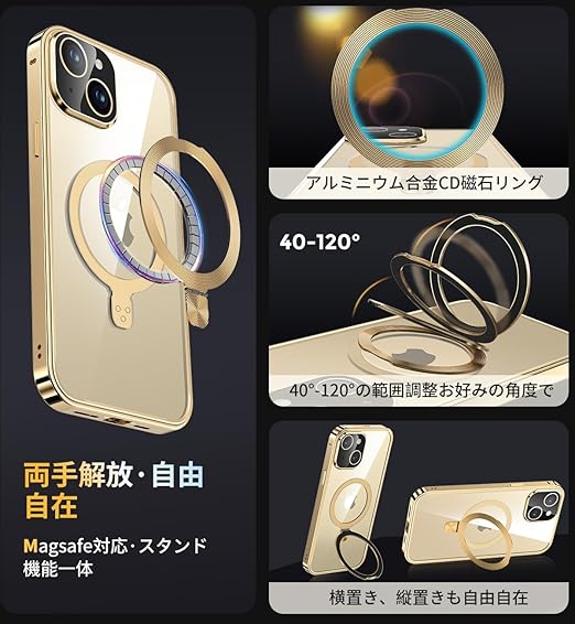 【全面革新!スタンド・CDリング・Magsafe対応】このあいふぉん15ケースは、動画鑑賞に便利なスタンド、CDパターンの質感の金属光沢のスマホリング、バッチリ付くMagsafe充電対応、多機能を一体化にしている、より便利で快適な暮らしを実現!このiPhone15 ケースは、高品質のアルミニウム合金CD磁石リングを搭載し、おしゃれで高級感が溢れています。3Way置き対応、縦横とも自由自在、40ºー120º回転可能で、最適な視野角を調節できます。これからは、映画鑑賞、オンライン授業、リモート会議、