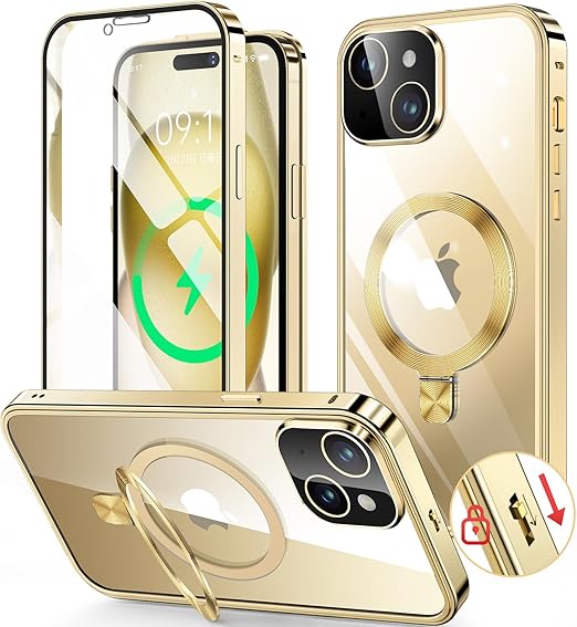 HGUTREY【スタンド機能付き・アクションボタン】 iPhone15 用 ケース クリア 【ロック付き】【CDリング・MagSafe対応】 9H強化ガラス PC背面 カメラレンズ保護 アイフォン15 カバー 両面 ストラップホール付き アルミバンパー メタルフレーム 耐衝撃 高感度タッチ ワイヤレス充電対応 アイホン15 用 ケース 6.1インチ(ゴールド) a