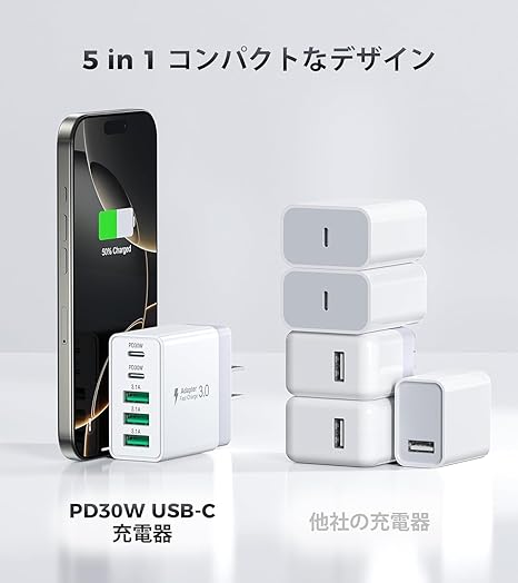 PD30W USB C 充電器:効率的な充電を実現する 2つの USB-C ポートと 3 つの USB-A ポートを備えた 5 ポート PD 高速 USB C 充電器。この Type-C 充電器は、合計出力 50W の Power Delivery および Quick Charge 3.0 テクノロジーを備えています。 USB-A ポートは 3.1A/5V 出力を提供し、USB-C ポートは 30W の高速充電速度を提供します。 iPhone 16/15デバイスを30分で0%から50%まで充電で