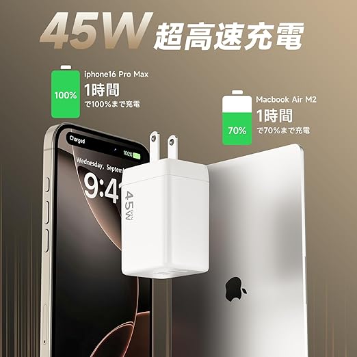 For iPhone16-充電器 45W Type-C PD USB-C 充電器 2ポート【2MC-Cケーブル】GaNFastII(窒化ガリウム)採用 超小型 折畳式プラグ アンドロイド充 電器 PD3.0/PPS規格対応/PSE技術基準適合 タイプc 充 電器 For iPhone16/15/14/GalaxyS23-S8シリーズ/MacBok Air/Pad Pro等対応旅行/出張 a