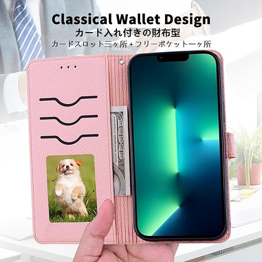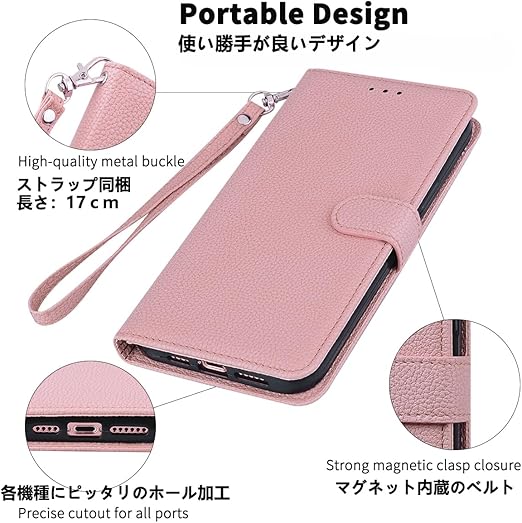 【特徴1:高品質PUレザー】軽量化のスマホケースです。外側カバーには滑り止めのライチ模様のPUレザーを採用します。内側のホルダーは柔軟なTPU素材を採用したソフトケースです。汚れにくくて指紋防止の特徴を持っております。耐衝撃の二重構造で落下の衝撃をうまく吸収します、本体をしっかりと守ります。