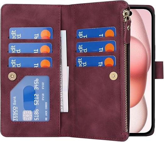 Eastwave アイフォン 15 ケース For iPhone 15 縄掛けケース For iPhone15 手帳型 財布型 ICカード コインポケット ストラップ付き カード 収納 小銭入れ ファスナーポケット付き PUレザー 6色レッド a
