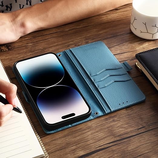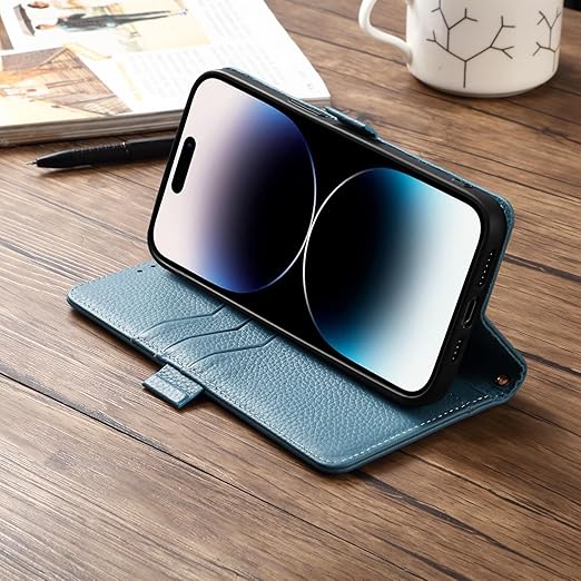 【 2023 新登場! 高級シュリンクカーフレザー】iPhone 15 Pro Max ケース 手帳型 本革 牛革 カード収納 サイドマグネット式 横置きスタンド機能付き 上下にストラップホール付き ストラップ付 アイフォン 15 Pro Max ケース 柔軟なTPU素材 耐衝撃 全面保護[Noble Series](iPhone 15 Pro Max、シアン) a