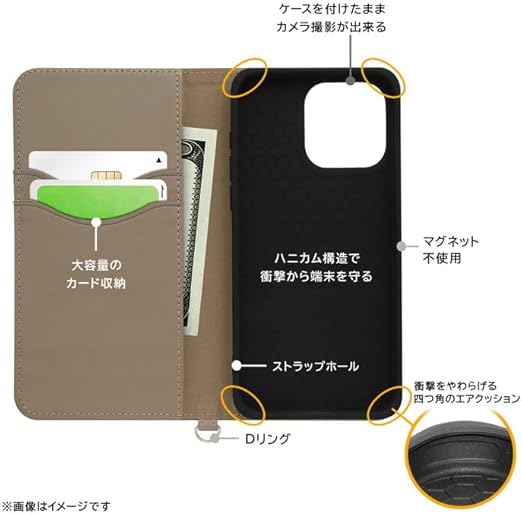 洗練された大人の手帳型ケース 風合いを楽しむムラ染めPUレザー / ケースを付けたままカメラ撮影可能 / カメラ穴 くり抜き カメラ / ケースをつけたまま撮影できる 撮影可能 カメラ撮影に便利 / 収納ポケット付き / レシートなども入れられる大きめの収納ポケット付き / カードポケット 大容量 2枚 3枚 4枚 / ICカード カードケース ポイントカード