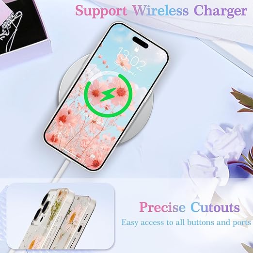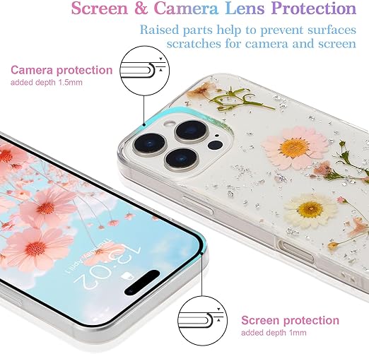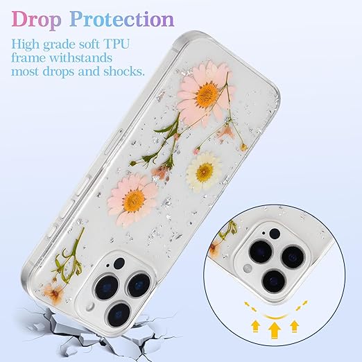 特別 ドライフラワー なデザイン:本物の花びらは、特別なエポキシ技術でケースに密封されています、非常に綺麗でオシャレです。いつでも自然の美しさを楽しむことができます!キラキラしている可愛い星型が施されているので、携帯をファッションアイテムに変身させます。