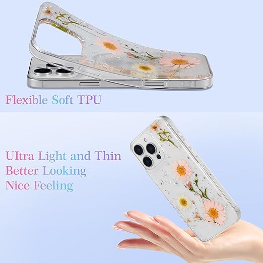 EYZUTAK 対応 iPhone 16 Pro 用の ケース クリア 可愛い 花柄 真花 透明 ソフト TPU 綺麗 美しい 本物の花 花びら キラキラ 銀箔 デザイン レディース 女性 ケース 全面保護 耐衝撃 薄型 軽量 カバー - ピンクの花 a