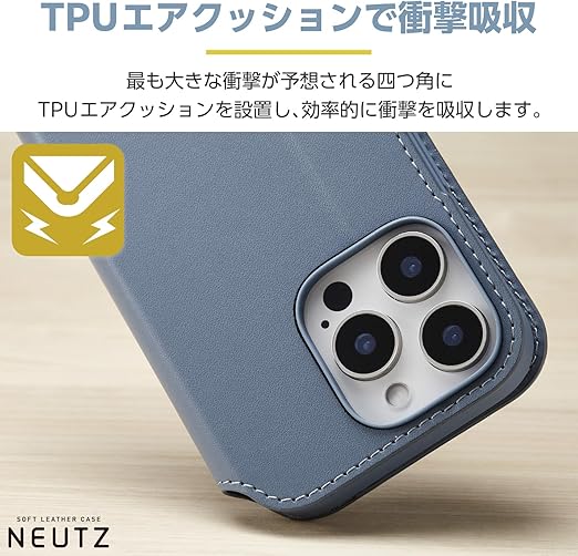 エレコム iPhone 16 Pro ケース カバー 手帳型 ソフトレザー 磁石付き カードポケット×2 スタンド機能 ワイヤレス充電対応 ストラップホール付き 4つ角エアークッション NEUTZ ブルー PM-A24CPLFY2BU a