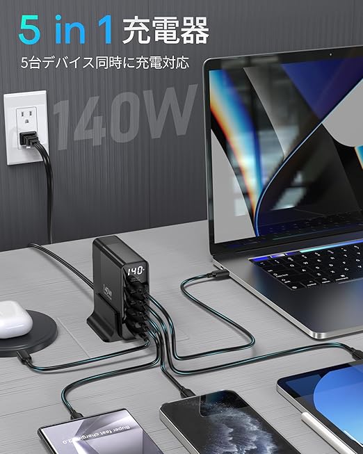 【5IN1 急速充電器・コンパクトデザイン・単ポート最大 100W】TOPADREはハイパワー AC アダプター 充電器の専門メーカーです;3つのUSB-Cポート(単一ポート充電最大100W)と2つのUSB-Aポート(単一ポート充電最大60W)を搭載し、ノートPC・タブレット・スマホ・イヤホン・スマートウォッチなど複数機器の同時急速充電が可能。合計140Wの高出力で、5台の機器を同時に超速充電することができます。一つのUSB タイプc 充電器コンセントだけで、usb コンセント占有やデスク周りの