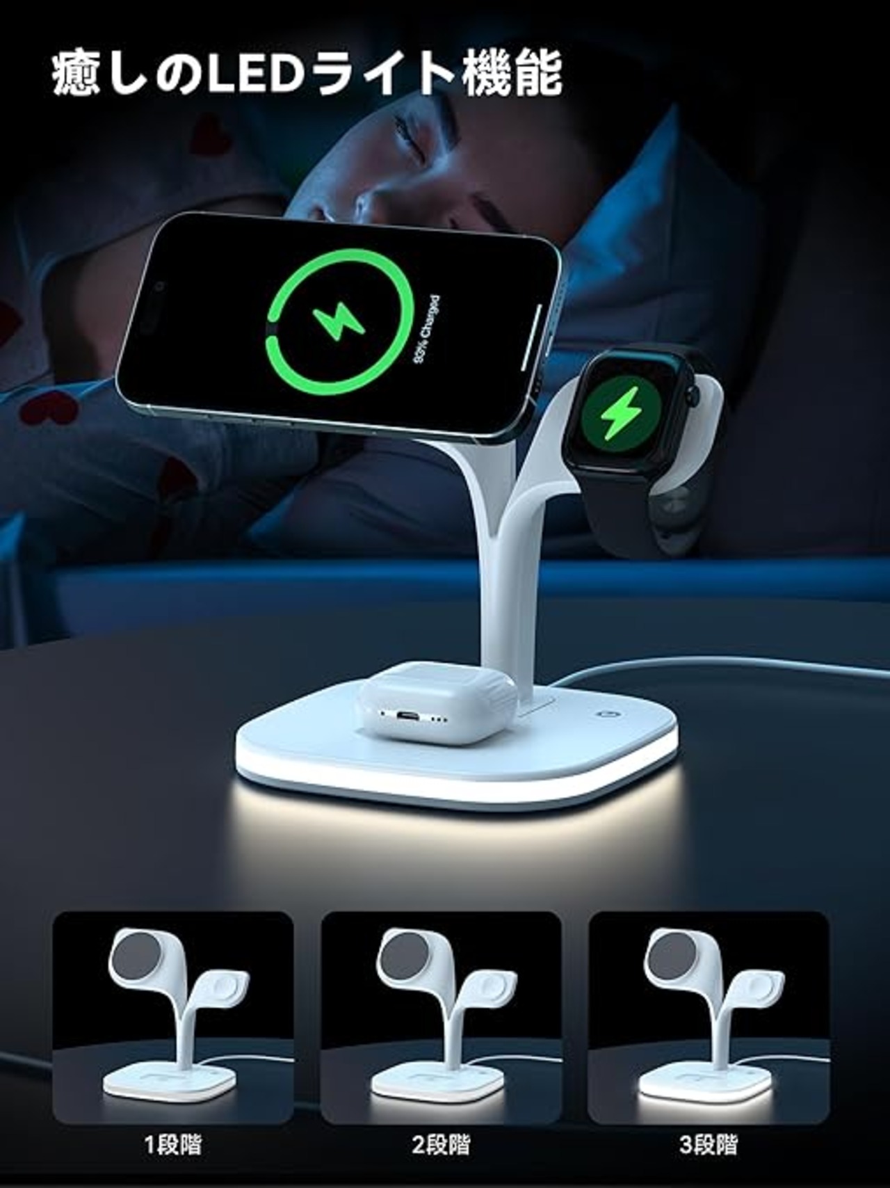 【3台同時充電で、最大15W急速充電】最大15Wの高速充電に対応し、置くだけで簡単に充電を開始できます。iPhone、iWatch、AirPodsを一度に充電できる3-in-1設計。忙しい毎日の中で、複数のデバイスを同時に効率よく充電し、時間と手間を節約します。家庭やオフィスでの煩雑さを解消し、すっきりとした作業環境を実現。