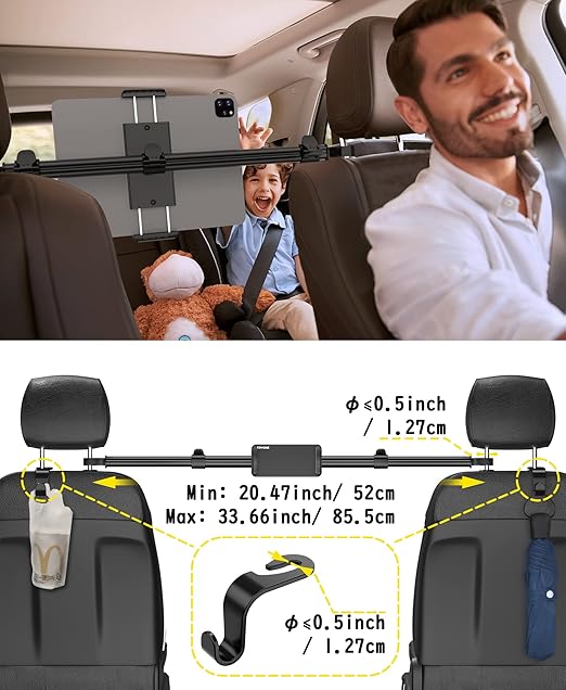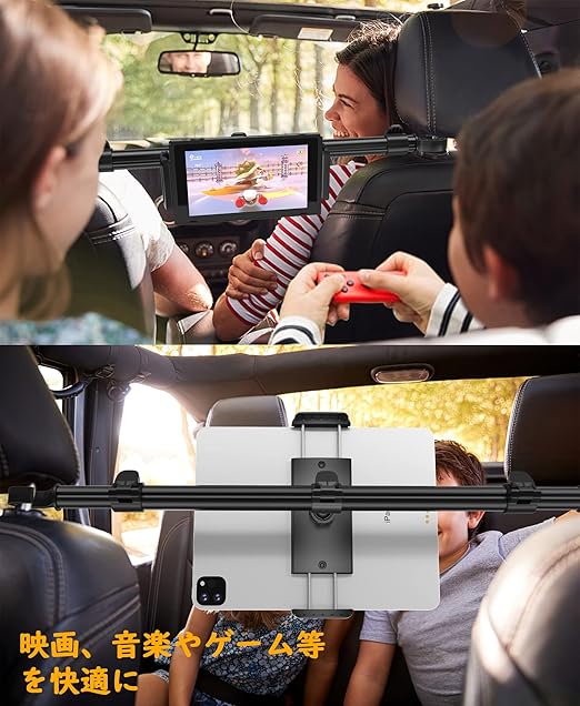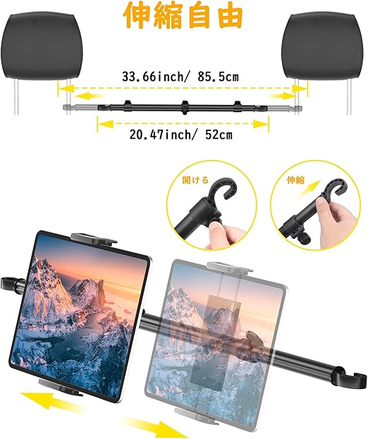 【2024革新版車載ホルダー真ん中にしっかり固定長さ調整デザイン】2024年TRYONE革新版タブレットホルダ−を楽しんでください! 前のタブレット 車載ホルダーより安定性を大幅にアップして、両端固定型を開発しており、左右側にクロークランプを設計して座席の真ん中にしっかり固定できます。また、アームが最大85.5cmまで伸縮できるので両側のバックルを開けて好みに合わせて後席スペースのどこでも最適な視野角度を楽しめます。車が凸凹の道に走行しても安定です。