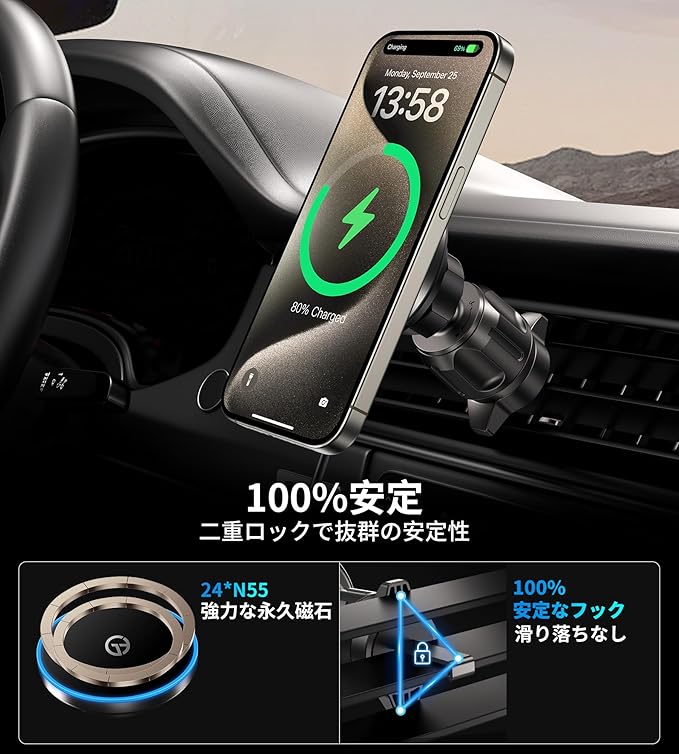 【magsafe充電器 車対応|15W急速充電】インテリジェントな熱管理により、純正のMagSafe充電器とほぼ同じなスピードを実現。急速充電には18W以上のQCアダプターが必要(アダプターは別売り)。充電中もスマホをしっかりホールドし、揺れても外れません。この車載マグセーフ充電器はiPhone16/15/14/13/12シリーズに対応します。ご注意:iPhone12以前の機種の場合、本体に吸着できるマグネット部分がないため、本製品はご使用いただけません。
