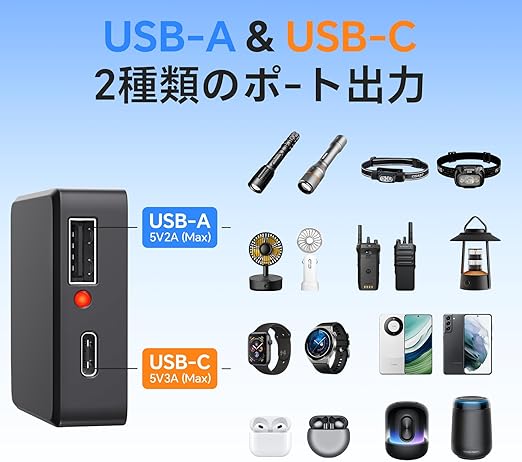 【ソーラー充電: Type-C + USB-A】ソーラー充電器には2つのUSB(最大5V / 3A)出力ポートが内