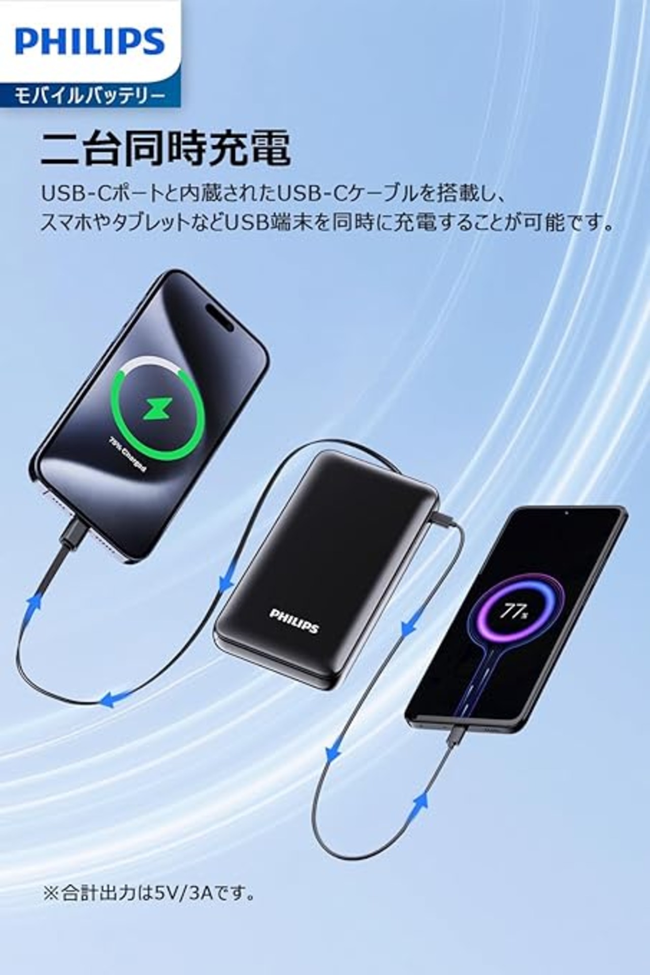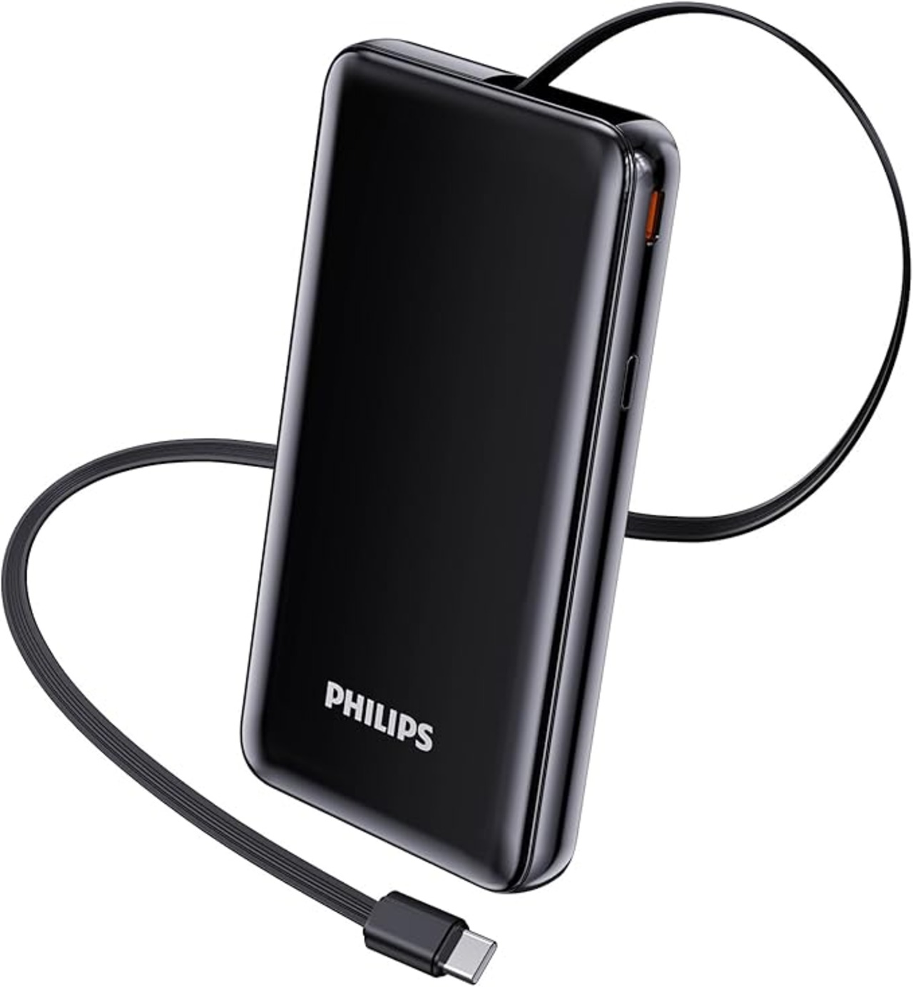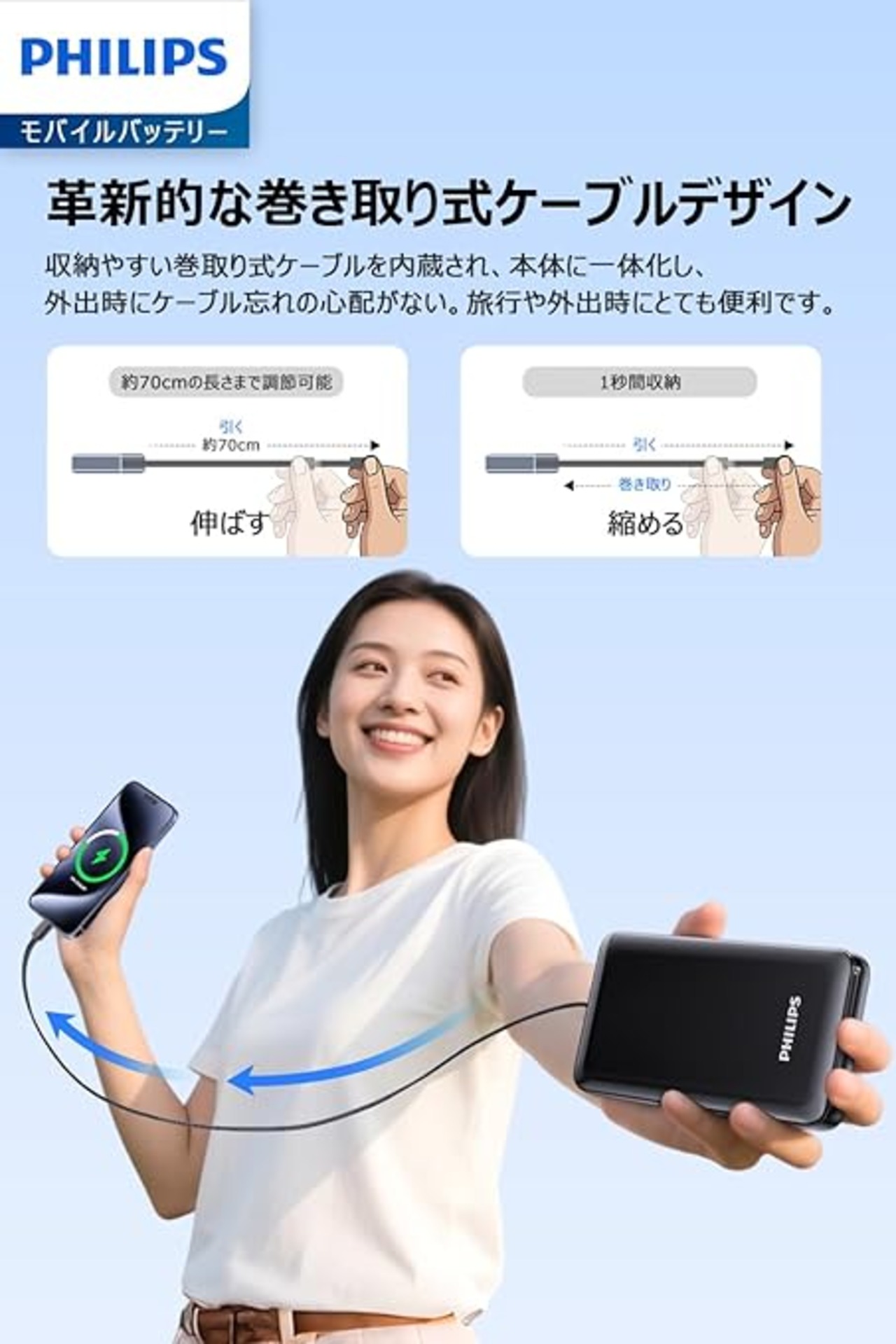 Philips (フィリップス) モバイルバッテリー 10000mAh大容量 巻き取り式USB-Cケーブル PD20W急速充電 出力入力対応 二台同時充電 パススルー充電 スマホ充電器 PSE認証済 多種保護 持ち運びやすい DLP1913C (ブラック) a
