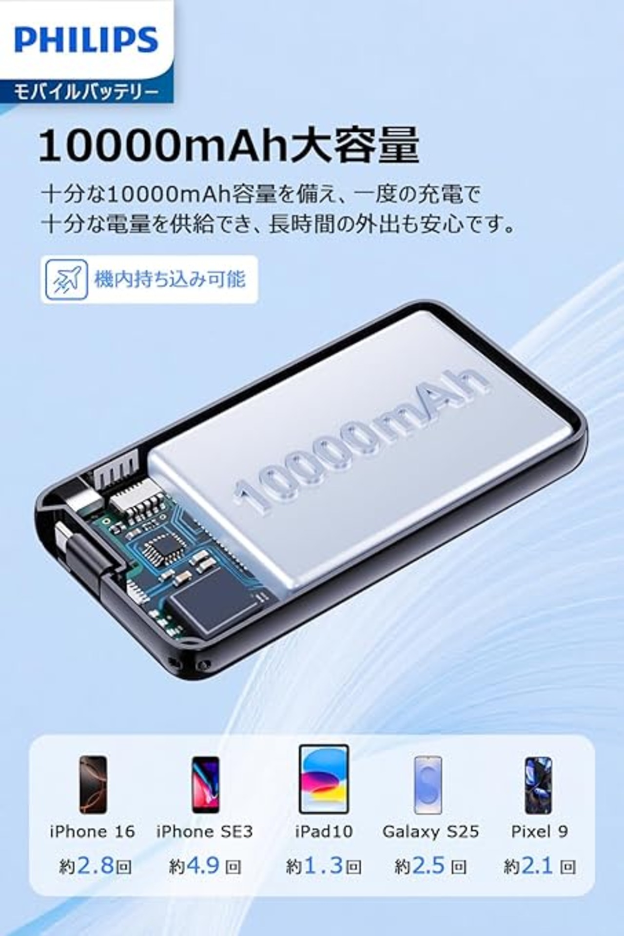 10000mAh大容量・PD急速充電:10000mAh大容量バッテリーを採用しており、iPhone 16に約2.8回、i