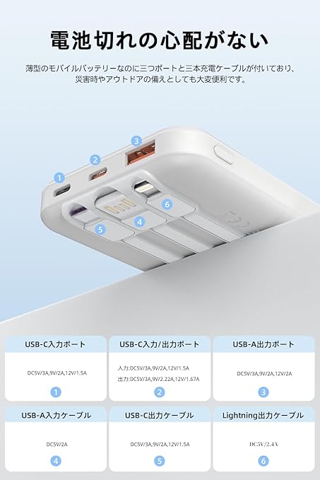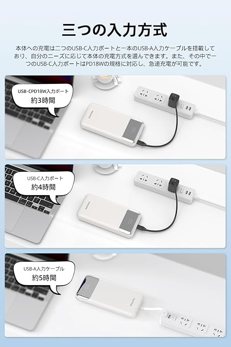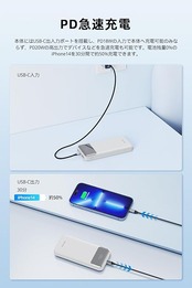 10000mAh大容量・LED電量表示:10000mAhの大容量バッテリーを備えて、iPhone 15に約1.8回、iPhone 3SEに約3回、ipad mini6に約1.2回を充電することができます。ほとんどのデバイスを複数回に充電可能なモバイルバッテリーです。また、LEDディスプライ画面が搭載し、一目で電池残量を確認できるので、電池切りの心配はありません。