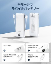 モバイルバッテリー 大容量【10000mAh・4台同時充電・2025業界初登場】モバイルバッテリー 軽量 小型 スマホ充電器 携帯充電器 ACコンセント一体型 内蔵ケーブル USB Type-C出力モバイル 残量表示 PSE認証済 安全設計&回路保護 iPhone/Android/iPadなど対応 旅行/出張/アウトドア/停電/防災緊急用 (白) a