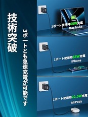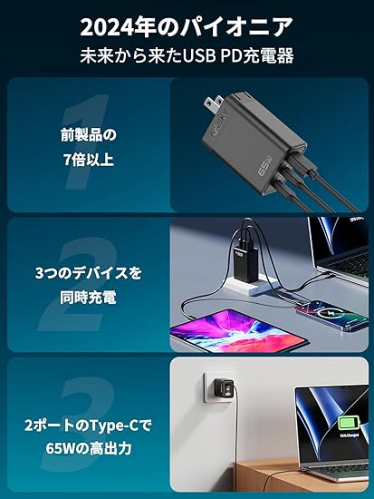 PD 65W USB 充電器 Type C 急速充電器 PD対応 USB-C×2 & USB A 3ポートGaN(窒化ガリウム) 折りたたみ式プラグ PSE技術基準適合 iPhone/Android/iPad/MacBook/ノートパソコン各種対応 その他USB-C/USB-A機器対応 a
