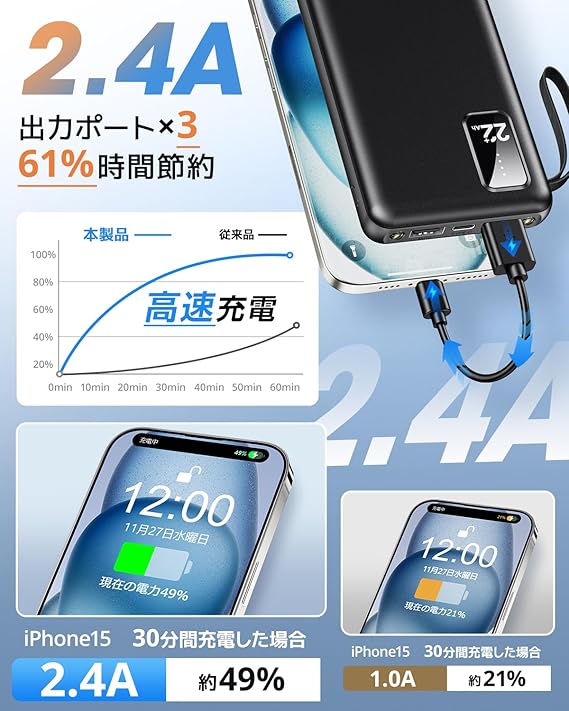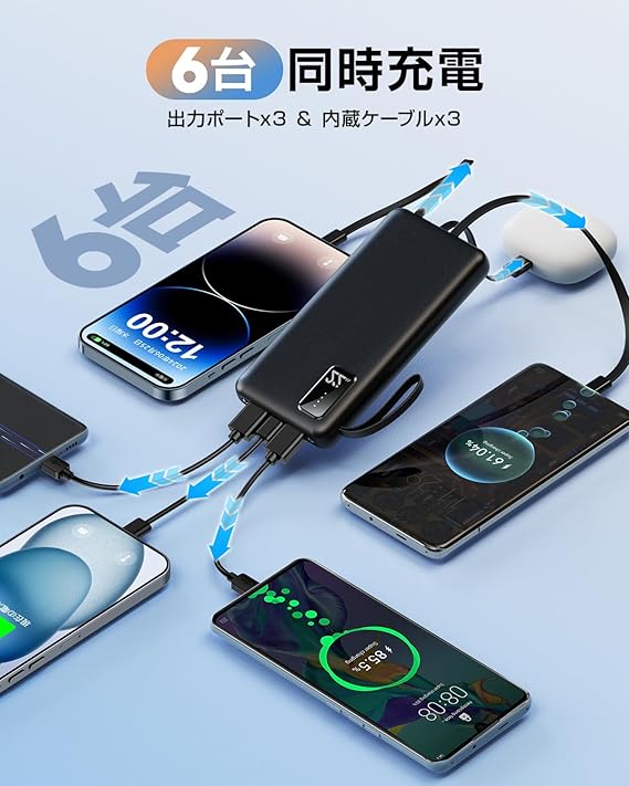 充電の達人 モバイルバッテリー 軽量 小型 22800mAh 急速充電 ケーブル内蔵 モバイルバッテリー 大容量 タイプC iPhone ライトニング 薄型 最大2.4A出力 5台同時充電可 LED残量表示 持ち運び便利 機内持込可 旅行/出張/アウトドア/停電/防災緊急用 Android全機種対応 防災グッズ LEDライト付き a