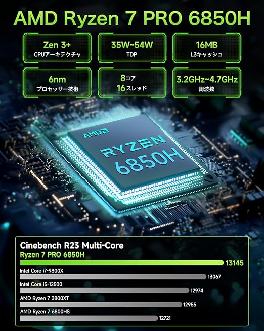 【AMD Ryzen 7 PRO 6850H プロセッサー| 5年以上使える安心設計】:GMKtec M7 Ryzen7 PRO 6850H(8C 16T、16 MB L3キャッシュ、3.2-4.7 GHz)は、[超長寿命設計] 32GBメモリ&1TB SSD搭載、高性能ミニPCで5年以上の安心稼働を実現。OSやソフトの進化にも余裕で対応!TSMC 6nm FinFETプロセスを使用して作られた超薄型プロセッサーです。ゲーミングミニpc 6850H プロセッサーには6nmチップが搭載されており、