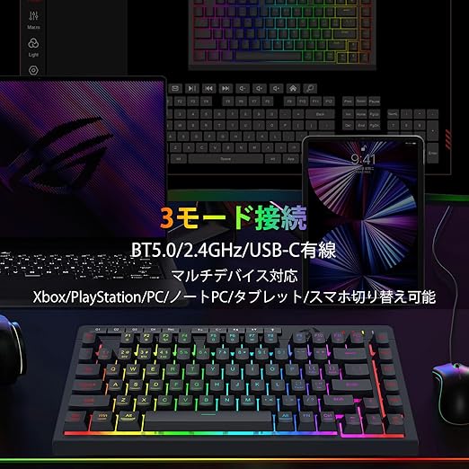 【3方式接続&マルチデバイス対応】Bluetooth 5.0/2.4GHz無線/USB-C有線の3接続方式を採用しています。最大5台のデバイス(PC/Mac/スマートフォン/PlayStation/Xbox)と同時接続が可能です。側面スイッチで簡単に切り替えられますので、リモートワークとゲームの両方のシーンで便利です。大容量4,000mAhバッテリーを搭載して、充電1回で約50時間(RGB点灯時)使用できます。