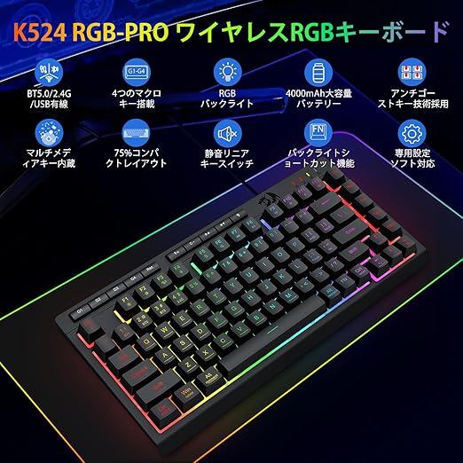 Redragon K524 ゲーミングキーボード ワイヤレス 3モード接続 Bluetooth 2.4GHz USB-C有線 打鍵感 75%コンパクト 英語配列 充電式 静音メンブレン 12個マクロキー アンチゴースト RGBバックライト カスタマイズ対応 4000mAhバッテリー XBOX/PS5/PC/Mac/スマホ対応 ブラック a