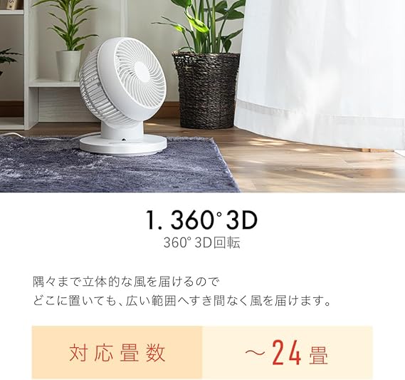 扇風機の左右だけの首振りとは違い、真上を含め、時計回り、反時計回りとグルっと回転するので、空気の循環、換気に最適です! 360度のお好きな角度で固定も可能!