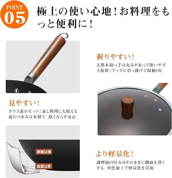 【中華鍋多機能】1鍋7役の万能性能 深さ9cmの実用設計で、炒め物からスープ煮込み、揚げ物まで対応。重量約1kgの軽量ボディで女性でも片手操作可能。木製ハンドルの耐熱グリップが滑り止め効果を発揮します。
