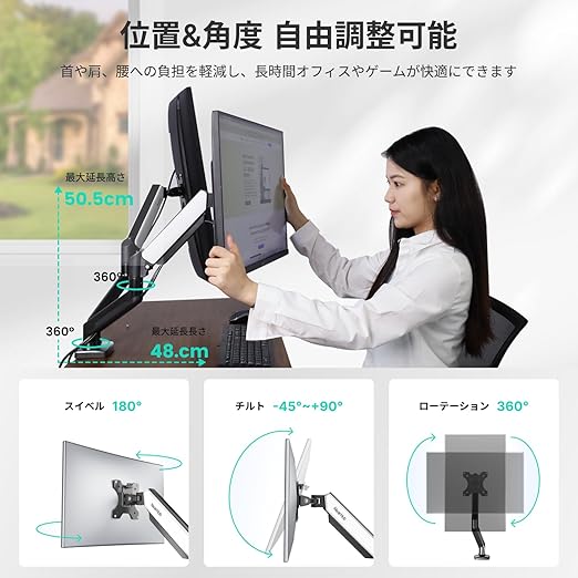 NearHub モニターアーム デュアル pc 13~32インチ対応 耐荷重9kg VESA規格 75x75mm/100x100mm 2画面 縦/横表示 多角度調節 ガススプリング式 安定性 クランプ式/グロメット式 ケーブル収納 広い可動域 高い位置 補強プレート 組み立て簡単 人間工学 ブラック&ホワイト MA20 a