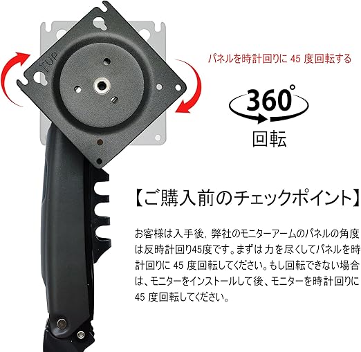 【全方位調節可能】①アーム:高精度のガススプリング使っている、垂直リフト距離260mm ②アーム関節部360° ③VESAプレート:上向き85°、下向き30°、回転360°、左右各90°。角度や距離等を自分に具合に合わせて簡単に調整できる。