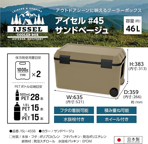 JEJアステージ アウトドアシーンに映える クーラーボックス アイセル サンドベージュ 46L 日本製[幅63.5×奥行35.9×高さ38.3cm]フタが外せてお手入れ簡単 軽量 ランチボックス 部活 アウトドア お出かけ レジャー スポーツ 水抜栓 キャスター付 a