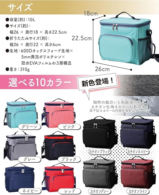 【商品規格】 容量(約):10L サイズ(約):幅26 × 奥行18 × 高さ22.5cm  折りたたみサイズ(約):幅26 × 奥行22 × 高さ6cm 生地:600Dオックスフォード生地×5mm発泡ポリエチレン×防水EVAフィルムの3層構造 重さ:310g