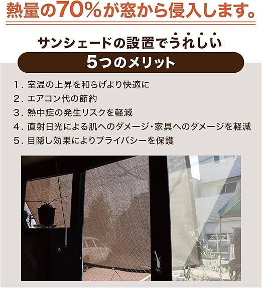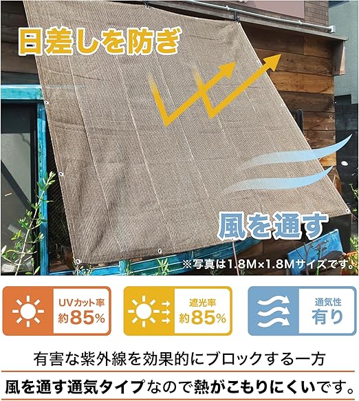 風を通す通気タイプの為、熱もこもりにくく、明りも適度に取るので室内も暗くなり過ぎません。ベランダ、玄関での使用はもちろん、キャンプ、BBQ等アウトドア時の日除けとしても大活躍します。