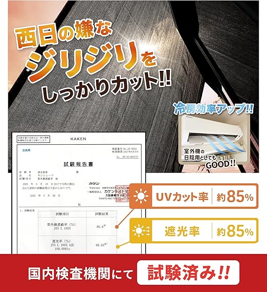 UVカット率約85%遮光・率約85%(国内検査機関にて検査済)。洋風にも和風にもフィットするサンシェードは、陽射しを和らげて涼しい室内空間を作ります。陽射しによる室内気温の上昇を和らげる為、暑さ対策はもちろん夏場のエアコン代節約にもなり経済的です。