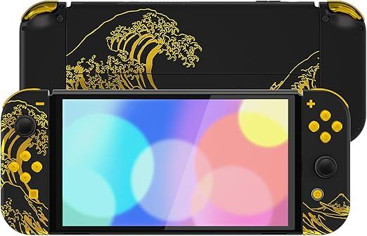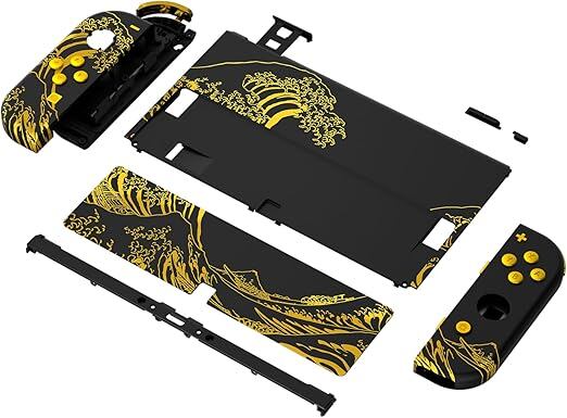 本体ではない-eXtremeRate switch 有機elに対応用スイッチ ジョイコンハンドヘルドコントローラーハウジング、switch oledに対応用パターン柄バックプレート&PCスイッチ 背面スタンド、キックススタンドとフルセットボタンが付き【神奈川沖の金色の波ブラック】 a
