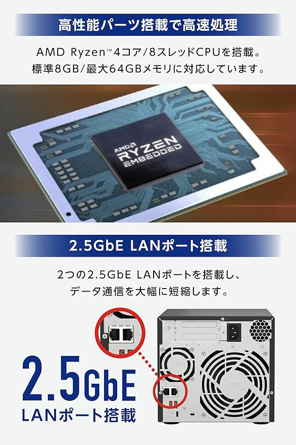 【高性能パーツ搭載で動作もスムーズ】CPUはAMD Ryzen クアッドコアプロセッサCPUを搭載。メモリも8GB搭載(増設で最大64GB)で安定通信を実現。