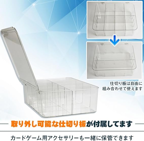 トレーディングカードの整理整頓に便利なフタ付き収納ケースです。内側には仕切りが付いているため、デッキごとや種類ごとに分けて保管できます。仕切り板は取り外せるので、区画サイズをお好みでカスタム可能です。